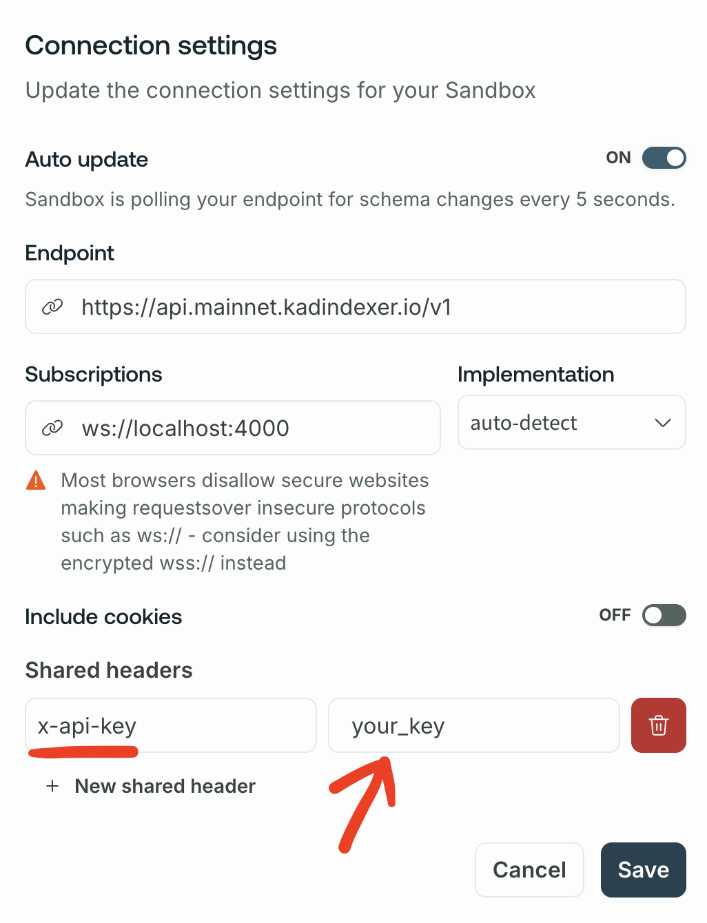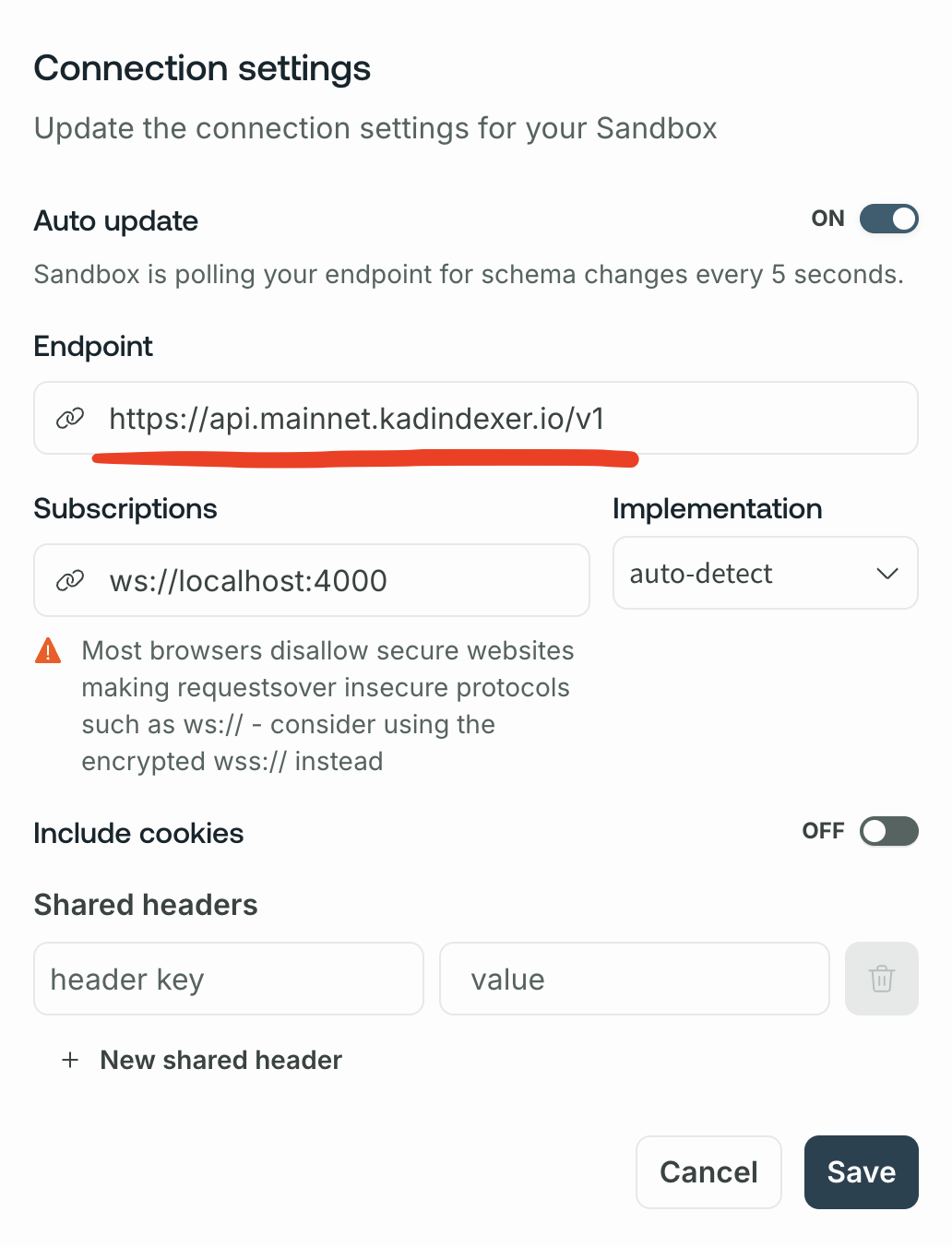 Testnet | wss://testnet04.kadindexer.io/graphql |